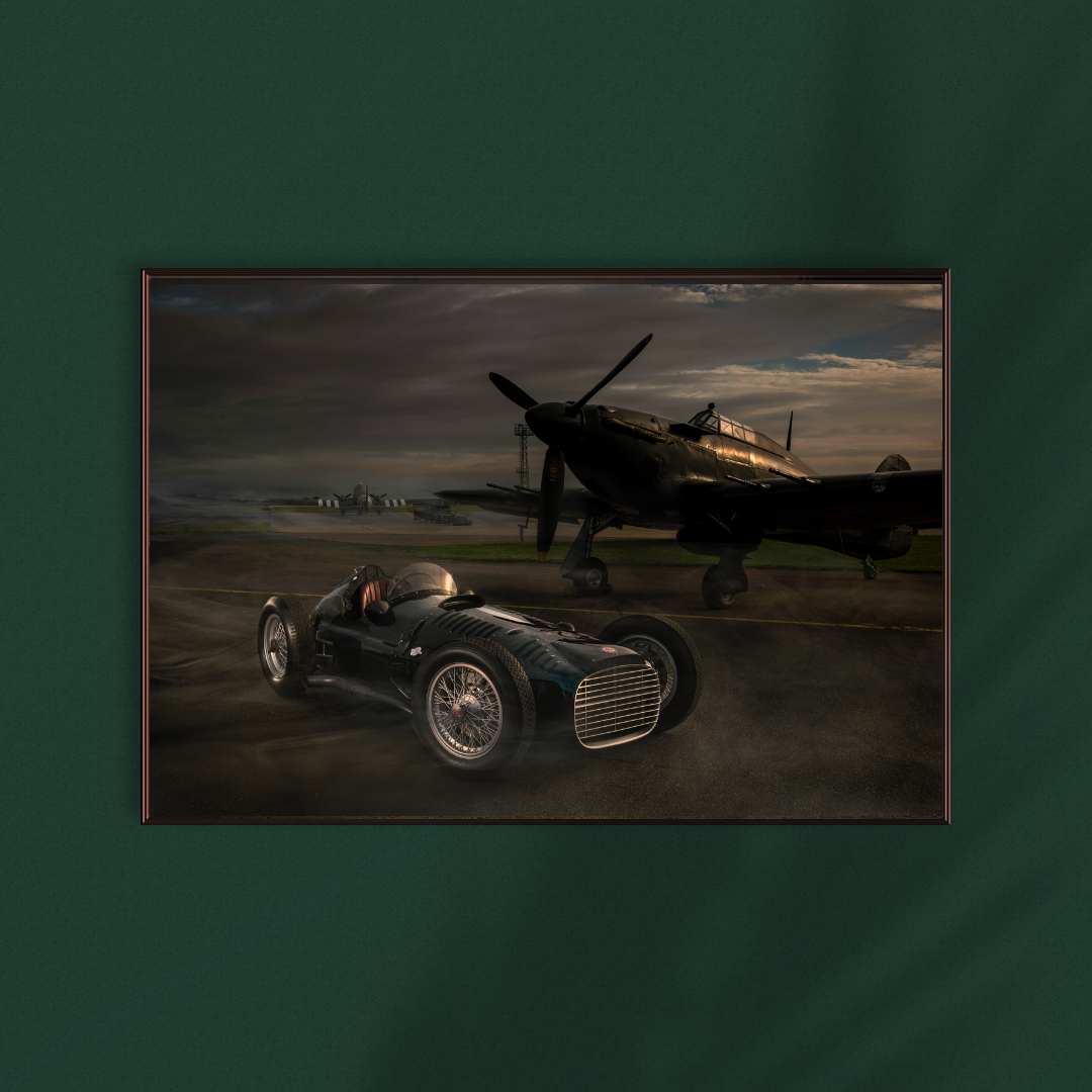 Print of the new Chassis No.IV P15 V16 overlooked by a Hurricane at RAF Coningsby.