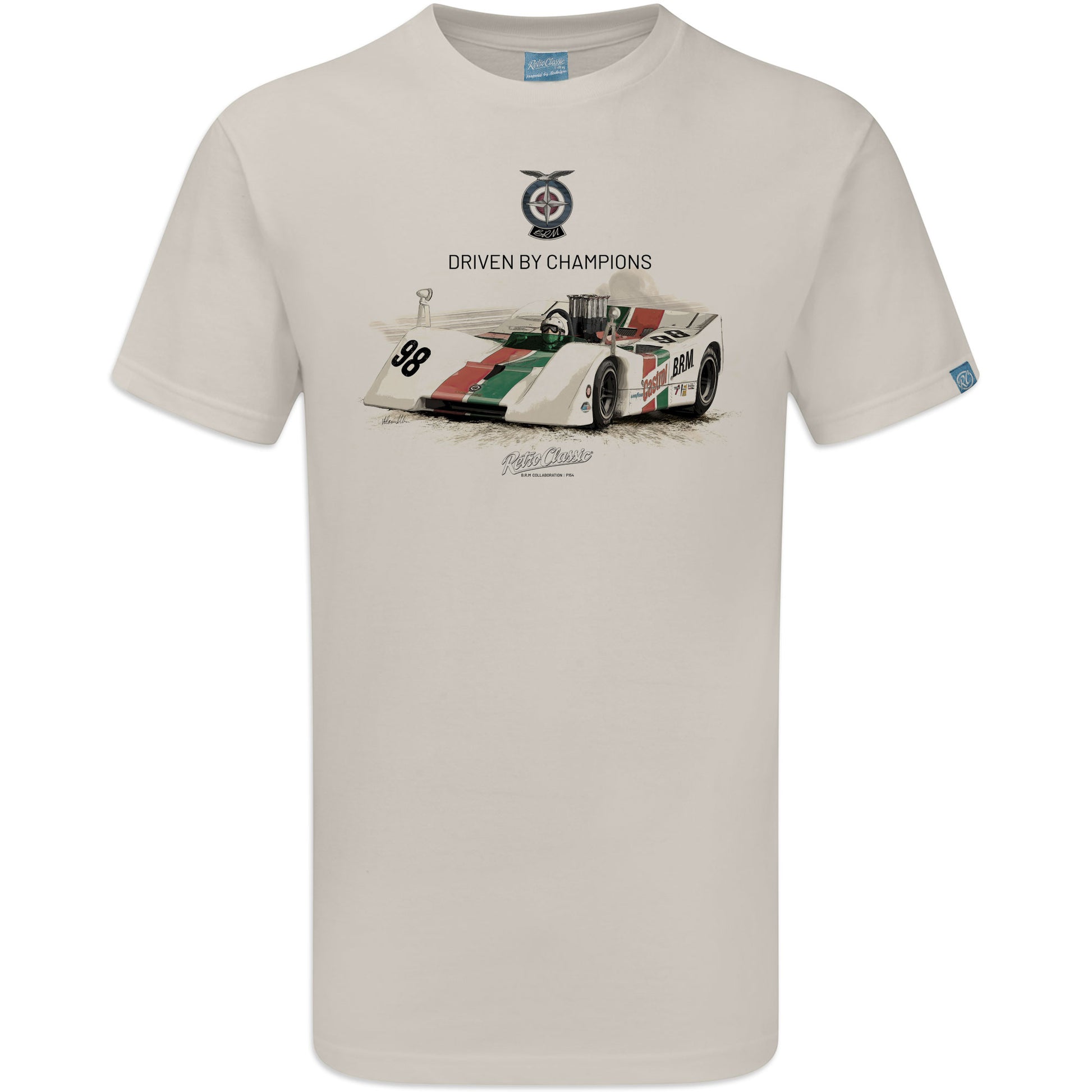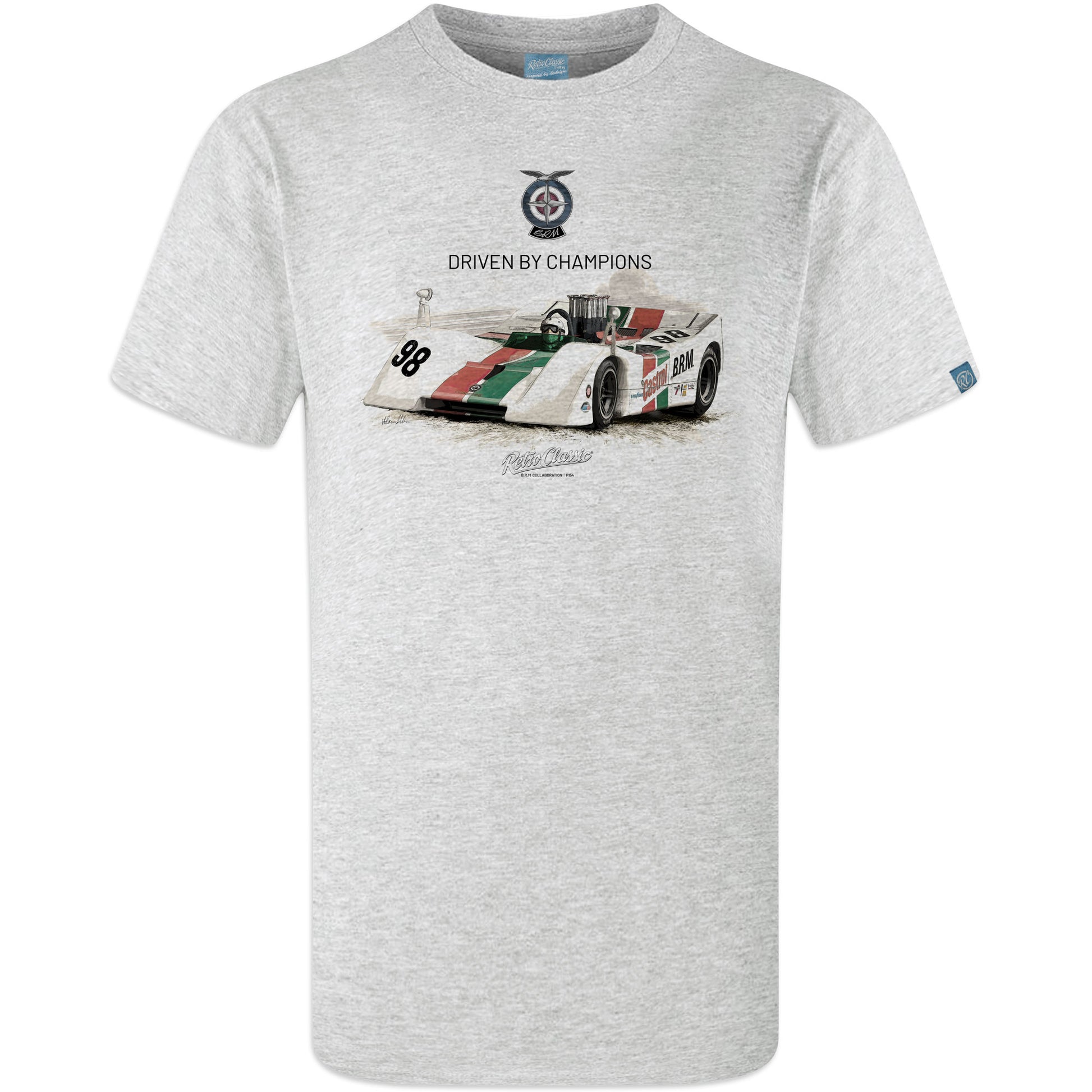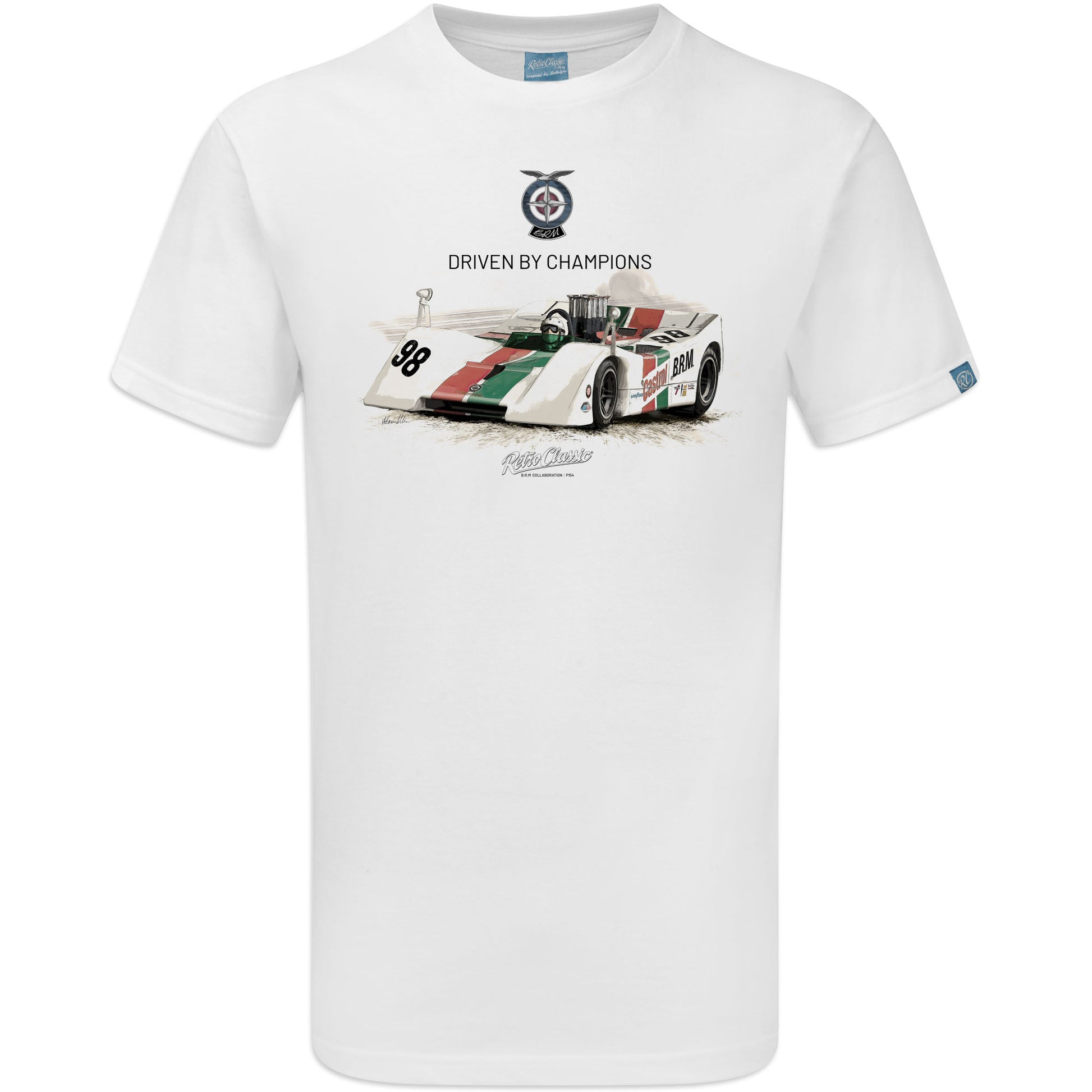 This T-shirt features BRM’s distinctive blue and red logo, inspired by the traditional racing colour scheme and the proud British tradition of Britain’s first and original F1 Team and a design of BRM's 1970 BRM P154 Can-Am Racing Series sports prototype race car.