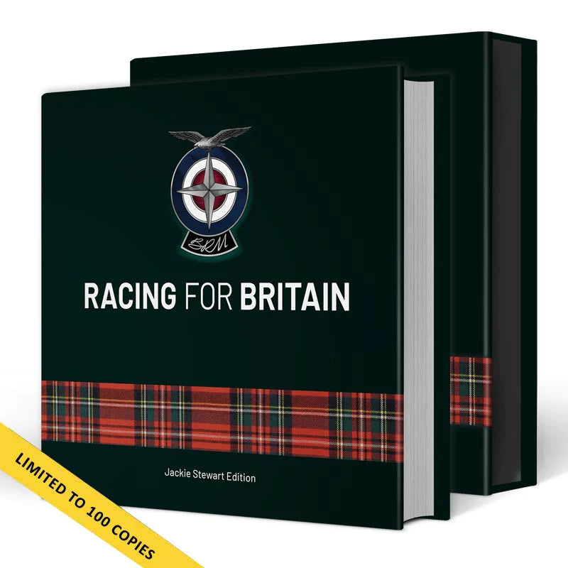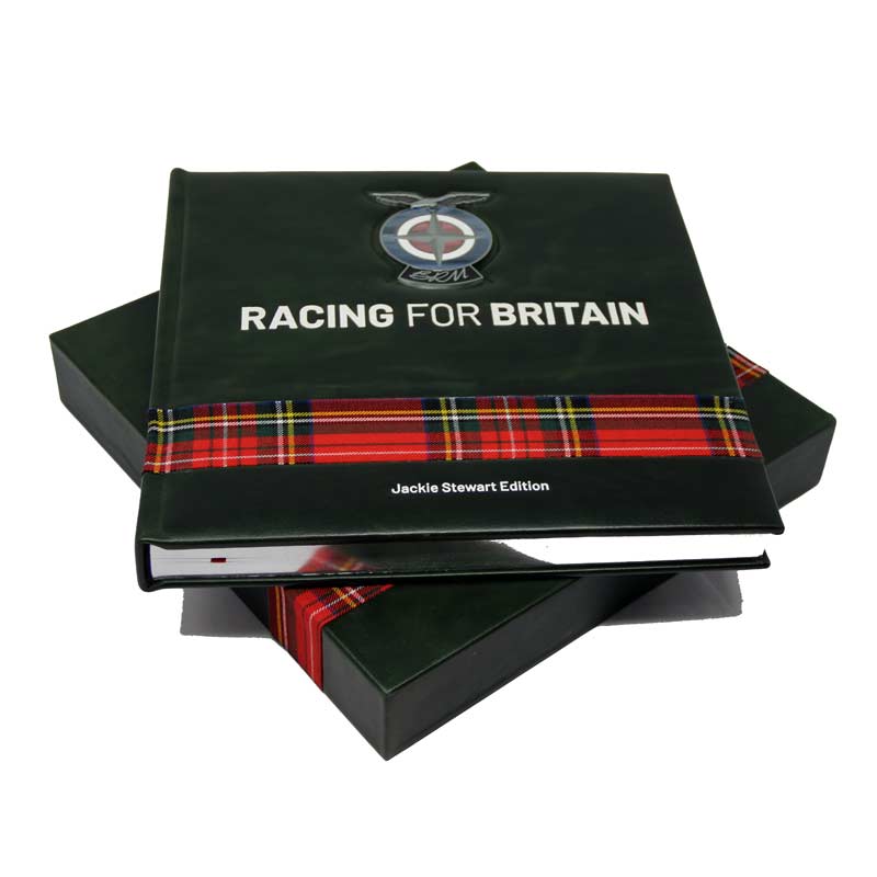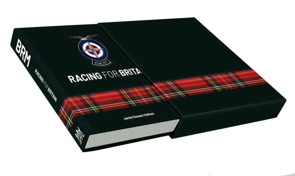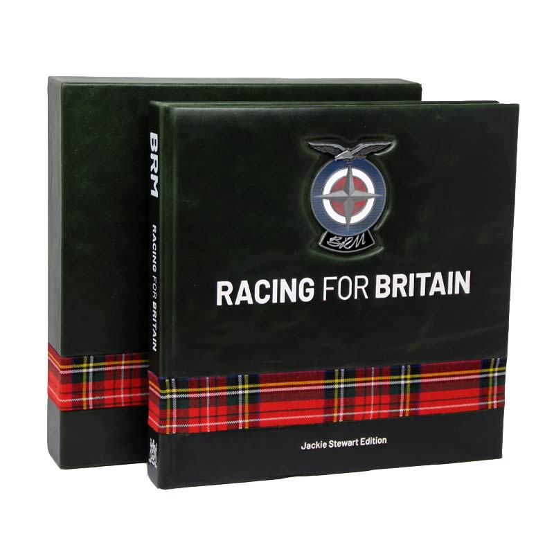 BRM – Racing for Britain (Jackie Stewart Edition) is bound in dark green leather with white text and an enamel BRM badge recessed into the cover. A wraparound inlaid strip of Sir Jackie’s signature Royal Stewart tartan features strongly on both the cover and the matching, leather-bound slipcase. Just 100 copies are available, each one signed by Sir Jackie Stewart OBE. £100 from each copy sold goes to his charity, Race Against Dementia