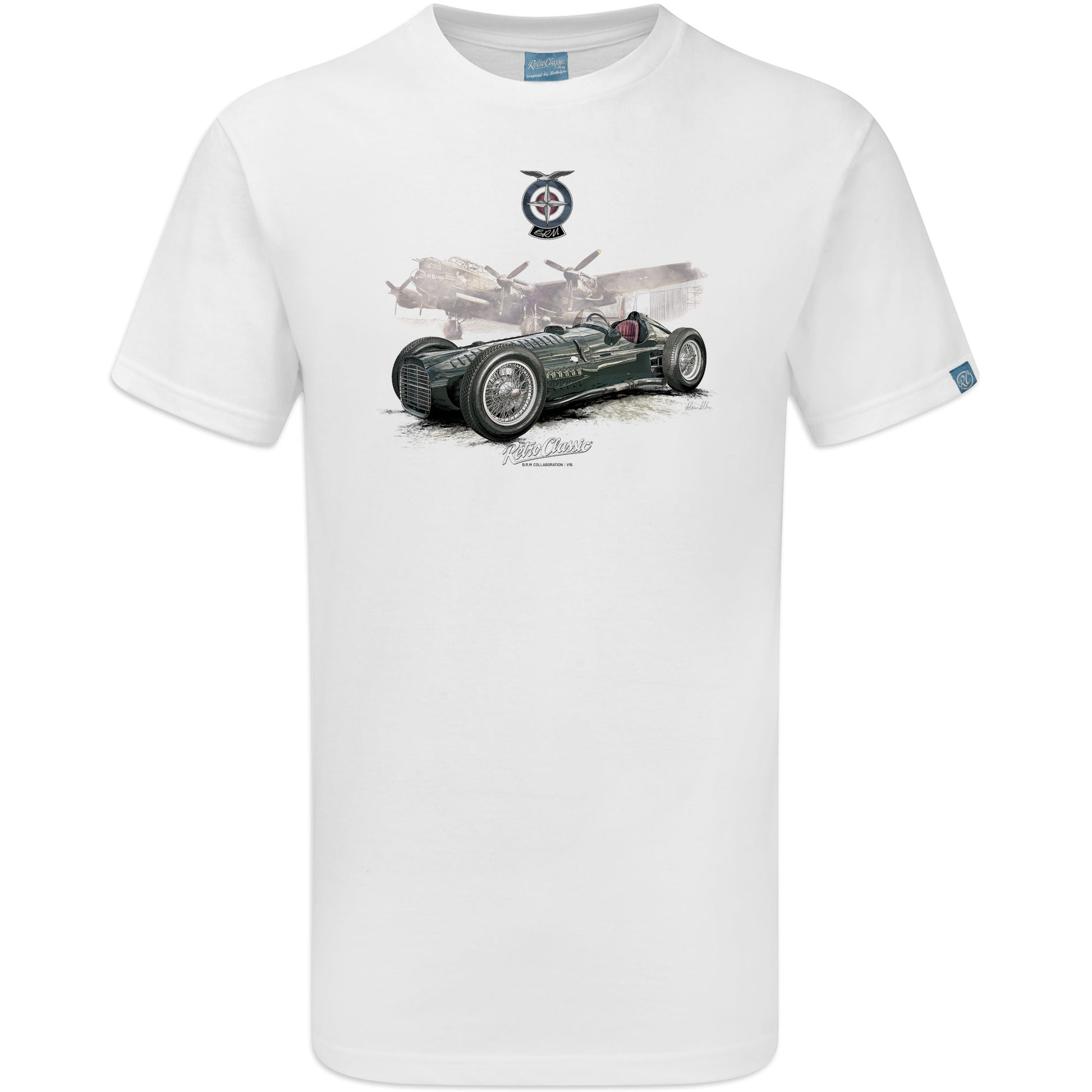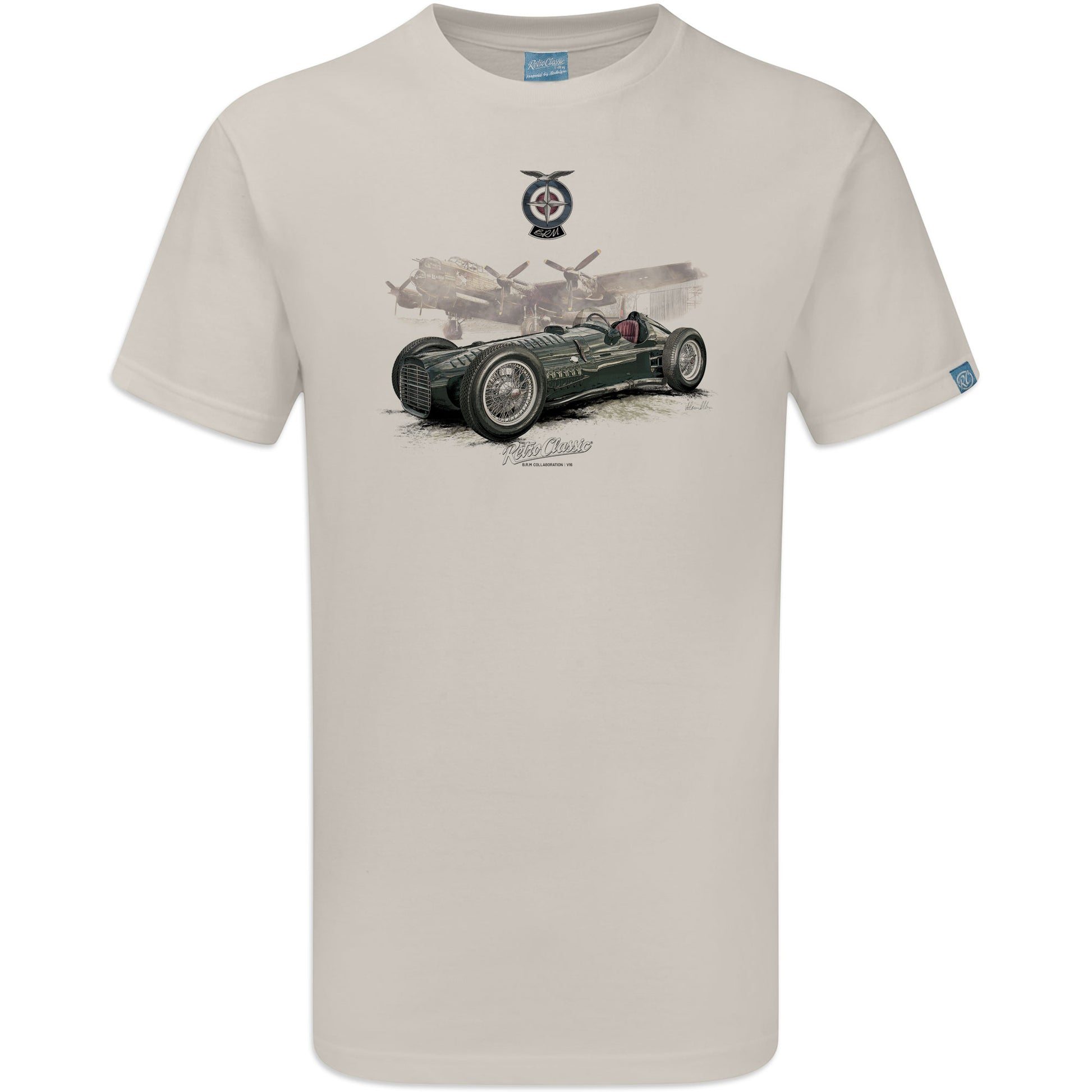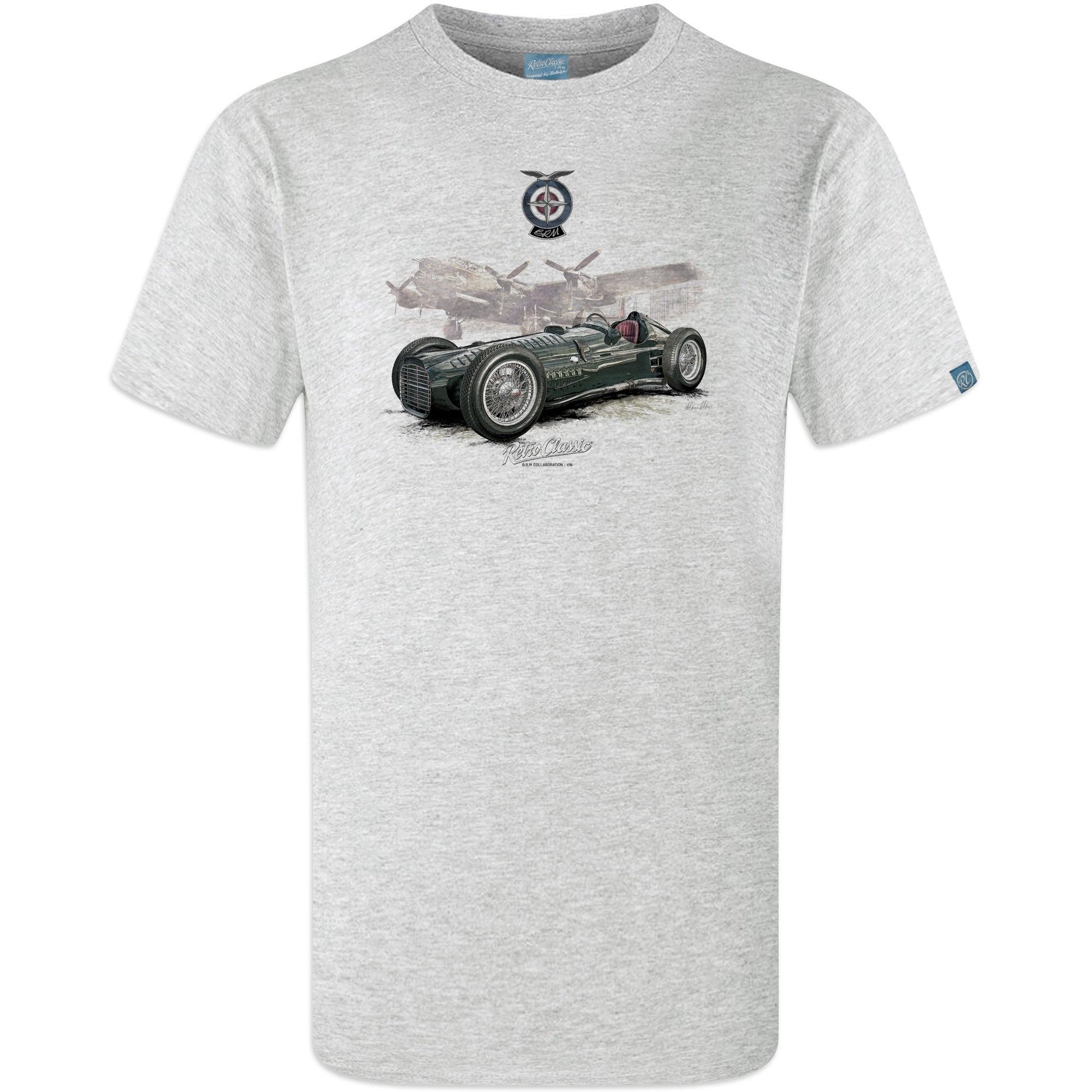 This T-shirt features BRM’s distinctive blue and red logo, inspired by the traditional racing colour scheme and the proud British tradition of Britain’s first and original F1 Team and a design of BRM's 1950, P15, 1.5 Litre, V16 MK 1 race car and a Lancaster WW2 bomber.