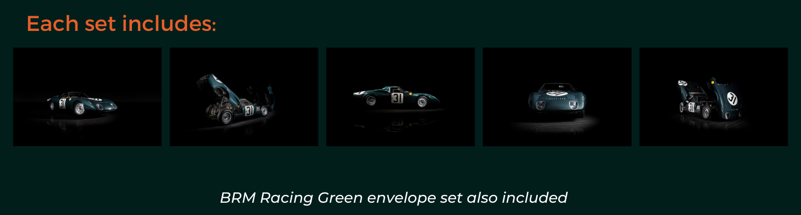Packed in a cellophane wrapper and enclosed within an outer Colompac Rigid Transportation packet. Cards come with a BRM racing green envelope set.