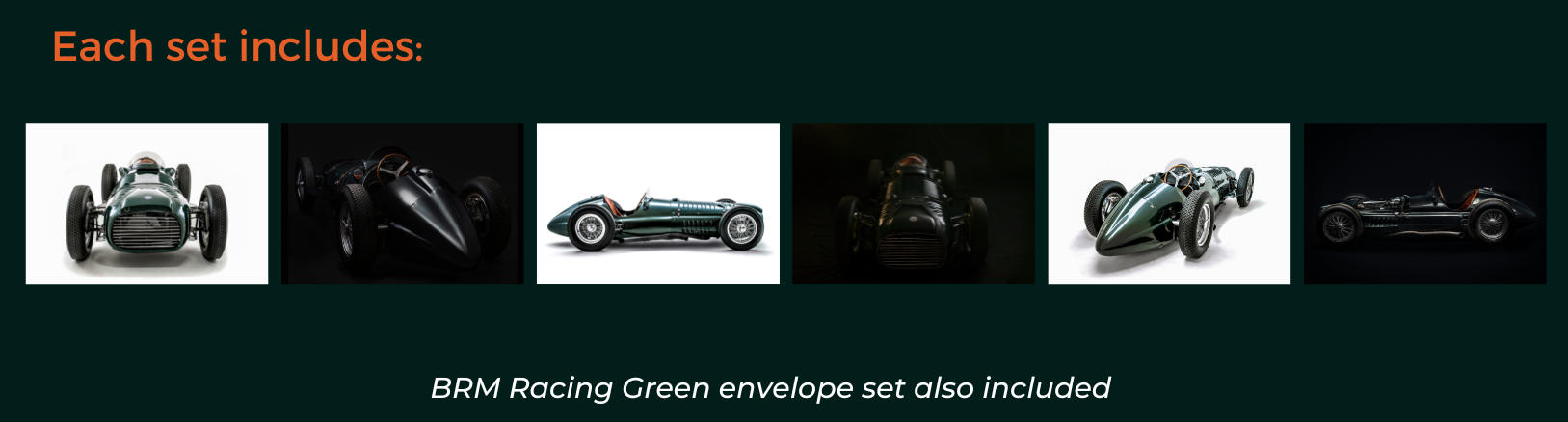 Card bundle featuring images of BRM's V16 as a celebration of our 'The Team That Beat The World' exhibition at the Silverstone Interactive Museum.