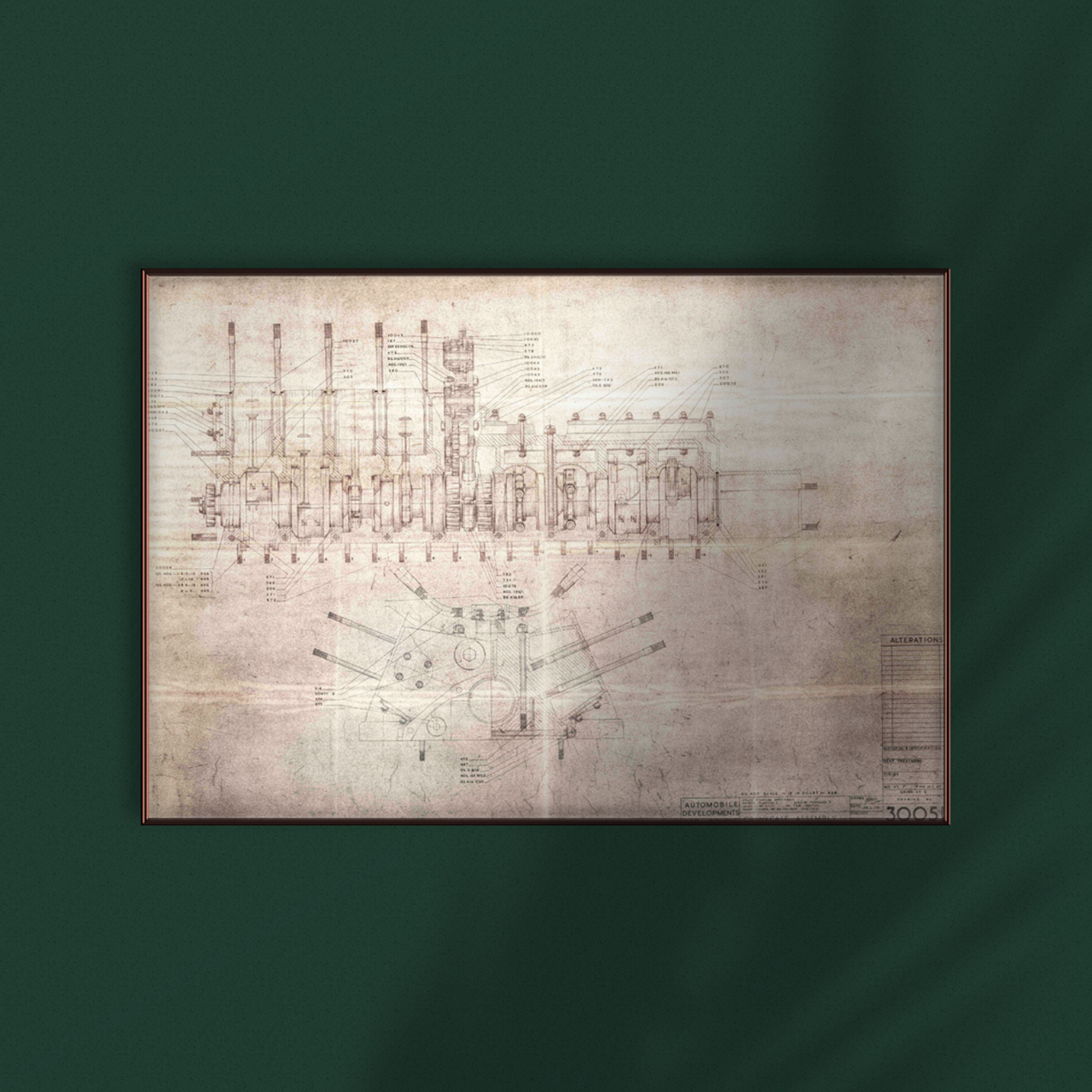 Print of the original hand-drawn technical drawing of the V16 Crankcase, dated 28th April 1948.